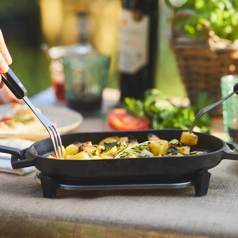 Pannen har et spesialdesignet avtakbart håndtak som gjør det enkelt å løfte den rett fra ovnen, og medfølgende stativ i rustfritt stål lar deg sette den direkte på bordet. Størrelsen gjør den godt egnet til både små og mellomstore porsjoner. Indre mål: 24,7 x 14,3 x 2,6 cm. Ytre mål: 31 x 15,9 x 3 cm.