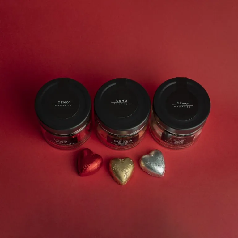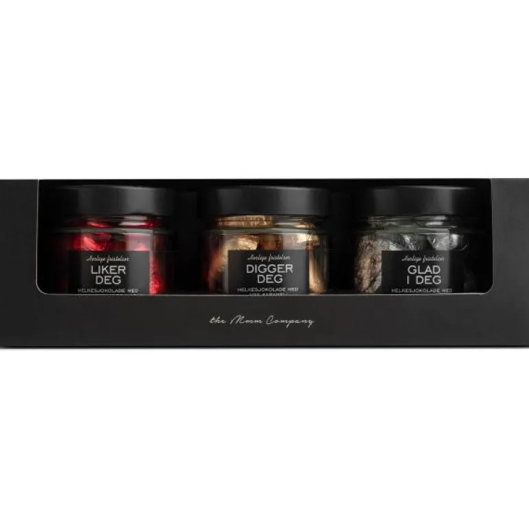 Sjokoladehjerter i rød, gull og sølv med navnene Liker deg, Digger deg og Glad i deg. Røde sjokoladehjerter med melkesjokoladeog mørk sjokoladeganache. Gull sjokoladehjerter med melkesjokolade og myk karamell. Sølv sjokoladehjerter med melkesjokolade og myk karamell.