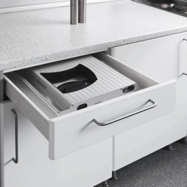 UNA90 er en oppskjærsmaskin med tiltefunksjon, fra tyske Graef, og er uunnværig kjøkkenmaskin. Slicern gjør det enkelt og raskt å kutte alt fra kjøtt og brød i tillegg til oster og mye mere, som bidrar til at man unngår matsvinn. Maskinen kan slås sammen og tas med rundt, eller bare oppbevares i en skuff. Et knivblad med Ø170 mm i rustfritt stål er inkludert. Dette er skjult bak en avtagbar dekselplate i rustfritt stål.