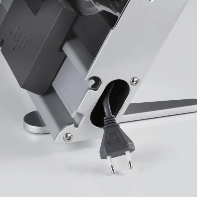 UNA90 er også utstyrt med en tiltefunksjon som gjør at skivene faller ned i det tilhørende brettet. Slicern kan betjenes med både kontinuerlig drift, som slås på på dreieknappen, eller via quick-action, som slås på direkte på sleiden. Tykkelsen kan justeres fra 0-15 mm og du kan derfor stille inn tykkelsen etter dine behov. Kabelen skjules enkelt inne i kabelrommet og maskinen står på sklisikre føtter. Matholderen har fingerbeskyttelse, som gjør maskinen trygg i bruk.