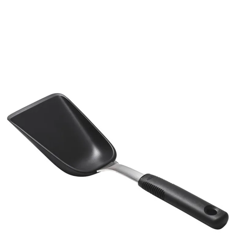 OXO skje til stekebrett 29 cm i svart/stål er en ovnspannesleiv som kombinerer funksjonalitet og brukervennlighet for enkel håndtering av mat i ovnspannen. Den brede utformingen gjør det enkelt å flytte store porsjoner kjøtt, fisk og grønnsaker uten å miste noe underveis, og de høye kantene holder ingrediensene sikkert på plass.