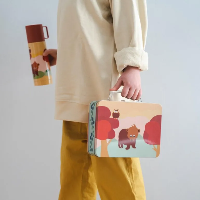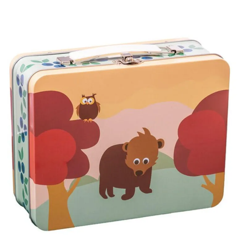 Koffertboksen «Skog» fra Blafre, i en livlig gul farge, er en romslig og dekorativ oppbevaringsløsning med målene 19×16 cm. Den er ideell til tørr mat, små leker eller andre småting, og kommer med et sjarmerende skogmotiv som tilfører et lekent preg. For å beskytte boksen ved oppbevaring av fuktigere matvarer, anbefales ekstra emballering som matpapir eller poser. Laget av metall, har boksen en lang levetid ved skånsom bruk. For rengjøring bør den tørkes av med en fuktig klut og deretter tørkes grundig, da den ikke tåler oppvaskmaskin eller fuktige forhold. En allsidig og stilfull boks som kombinerer praktisk bruk med et attraktivt design.