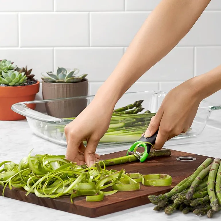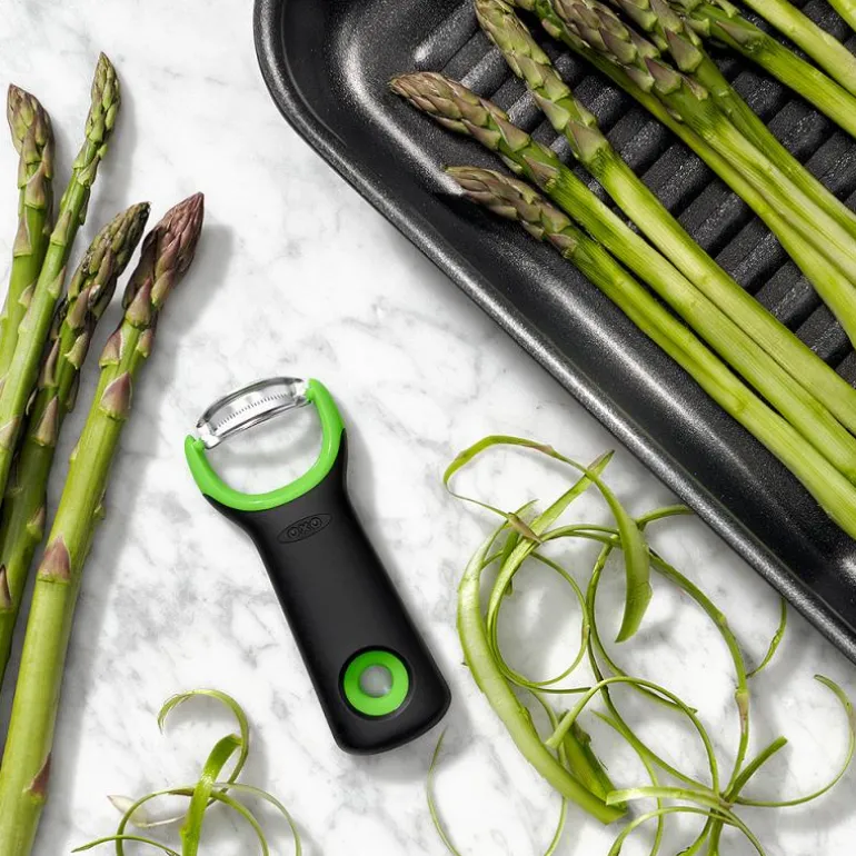 Skrelleren har et lett buet og riflet knivblad i japansk rustfritt stål som er spesielt designet til å skrelle det helt tynne skallet på asparges. Skrelleren har et håndtak av non-slip gummi og tåler oppvaskmaskin.