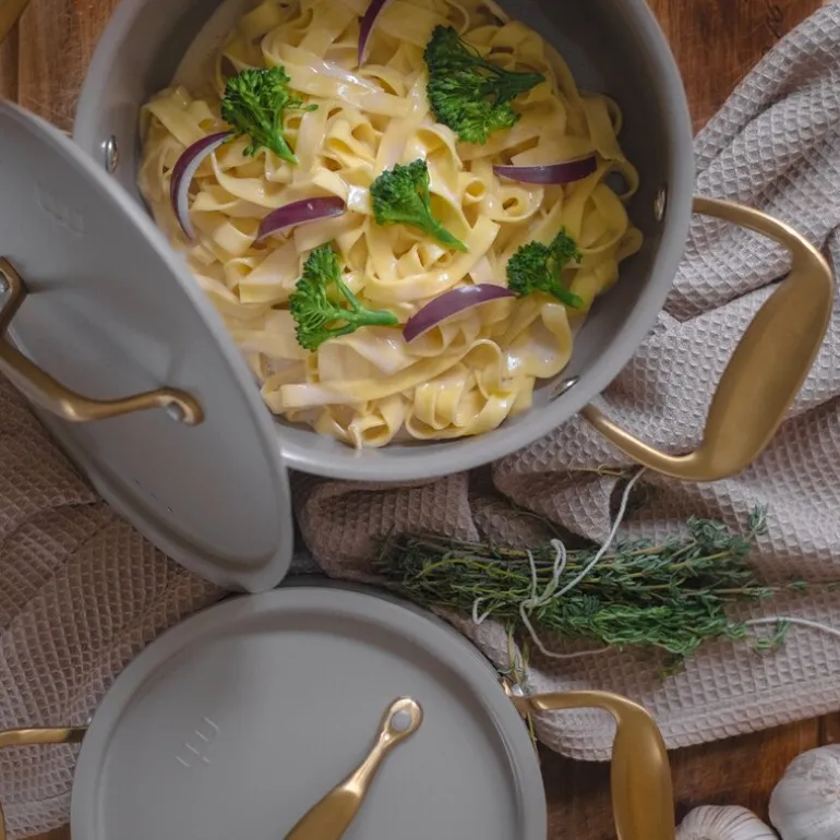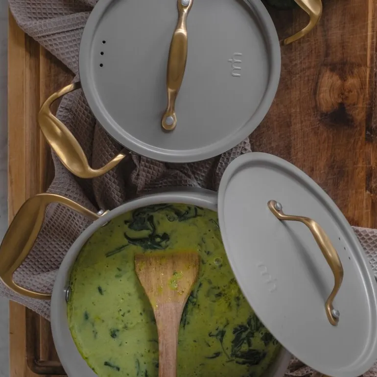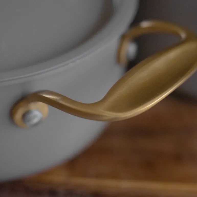 Sky gryte 1,6L fra Modern House er produsert i 18/0 stål og kommer i en dempet lattefarge med håndtak i børstet gull. Gryten har en 3-lagskonstruksjon med aluminiumskjerne som gir effektiv og jevn varmefordeling, og passer til mindre porsjoner eller tilbehør.