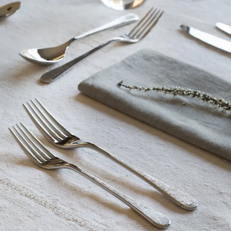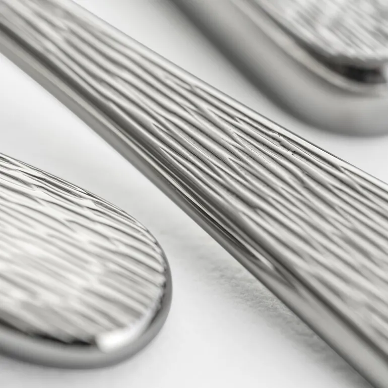 Det taktile mønsteret er inspirert av sølvsmedens klassiske teknikk med lang hammerplanering, og håndtakene avsluttes i en glattere overflate som gir et behagelig grep. Den skulpturelle overflaten reflekterer lyset og skaper et vakkert spill mellom tekstur og glans.