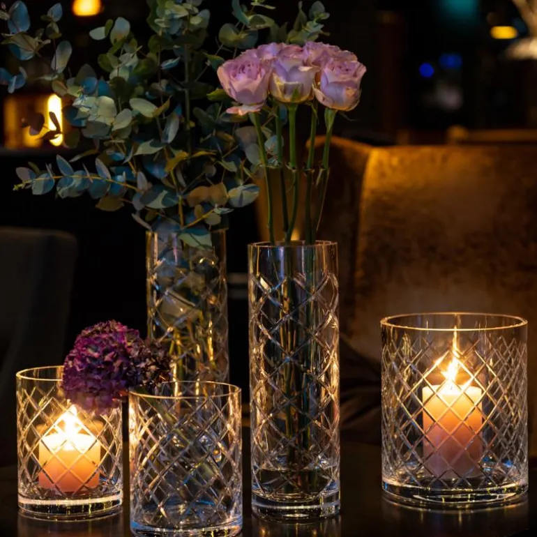 SKYLINE LUX CLEAR er isklar og funklende, og består av vase 30 cm, stormlykt/vase 15 cm og stormlykt/vase 20 cm med vidunderlige sylinderformer og glamorøs håndslipt dekor. Serien er håndlaget og munnblåst av erfarne glassblåsere og bærer Halvor Bakkes kjente signatur for varig verdi. Her oser det av ren luksus og ekte håndverk.