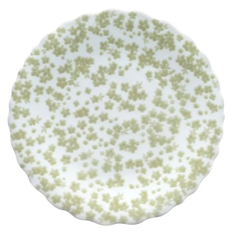 Slåpeblom grønn asjett 21 cm i benporselen, fra Wik & Walsøe. I naturen, når sollyset faller på slåpeblomstens kronblader, endrer nyansene seg fra det helt mørke i skyggen, til det helt lyse der solen skinner som sterkest. Slik er det også med kolleksjonen Slåpeblom.