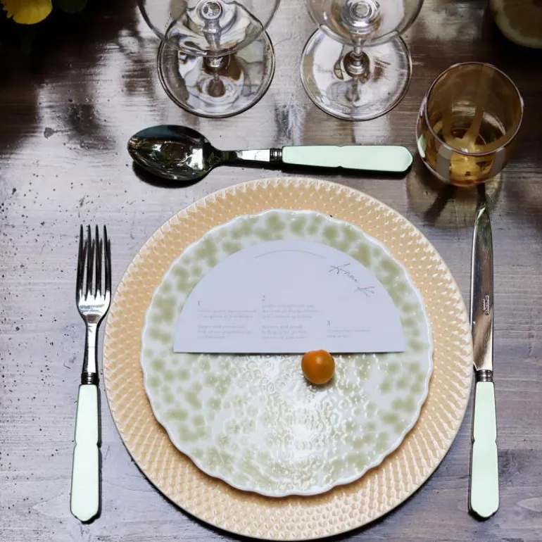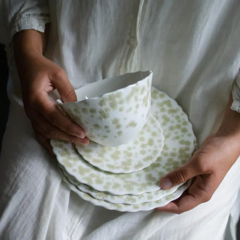 Benporselenet er lett gjennomgskinnelig og sart, men svært slitesterkt. Den er håndlaget, tåler oppvaskmaskin, mikrobølgeovn, stekeovn og hverdagslig bruk. Kolleksjonen kommer i varm grå, rosa, blå og grønn og det vil være variasjoner i fargenyansene. Dette gjør hver enkelt produkt unikt.