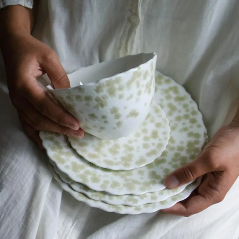 Benporselenet er lett gjennomgskinnelig og sart, men svært slitesterkt. Den er håndlaget, tåler oppvaskmaskin, mikrobølgeovn, stekeovn og hverdagslig bruk. Kolleksjonen kommer i varm grå, rosa, blå og grønn og det vil være variasjoner i fargenyansene. Dette gjør hver enkelt produkt unikt.