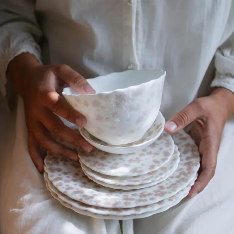Benporselenet er lett gjennomgskinnelig og sart, men svært slitesterkt. Den er håndlaget, tåler oppvaskmaskin, mikrobølgeovn, stekeovn og hverdagslig bruk. Kolleksjonen kommer i varm grå, rosa, blå og grønn og det vil være variasjoner i fargenyansene. Dette gjør hver enkelt produkt unikt.