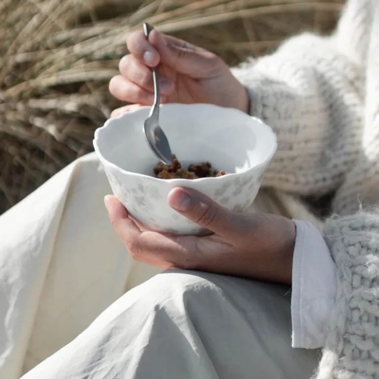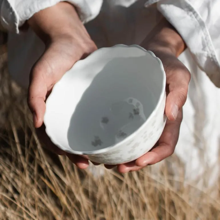 Benporselenet er lett gjennomgskinnelig og sart, men svært slitesterkt. Den er håndlaget, tåler oppvaskmaskin, mikrobølgeovn, stekeovn og hverdagslig bruk. Kolleksjonen kommer i varm grå, rosa, blå og grønn og det vil være variasjoner i fargenyansene. Dette gjør hver enkelt produkt unikt.