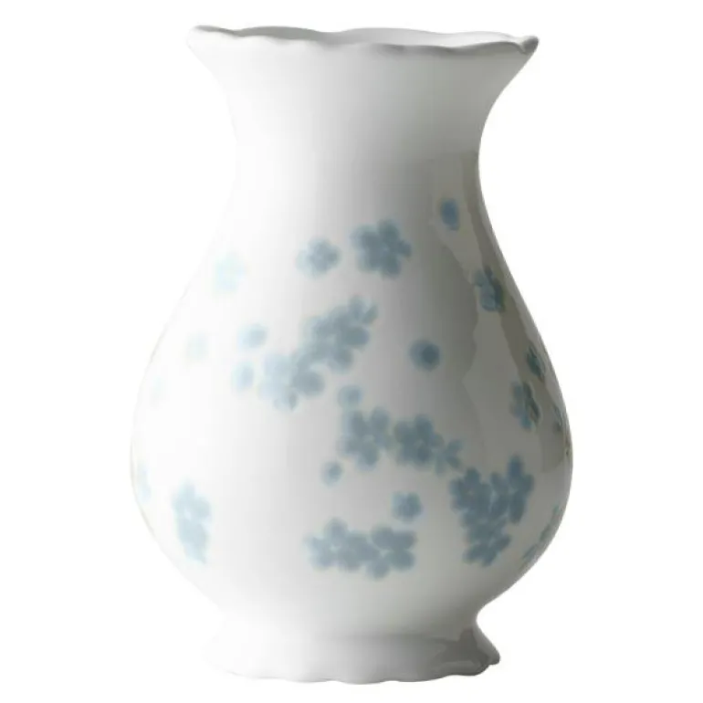 Slåpeblom blå vase fra Wik & Walsø i benporselen av høy kvalitet kjennetegnes ved den ujevne og bølgete kanten som fremhever følelsen av håndverk. Med produktet i hendene kan man kjenne det taktile mønsteret som preger designet.
