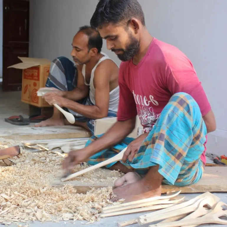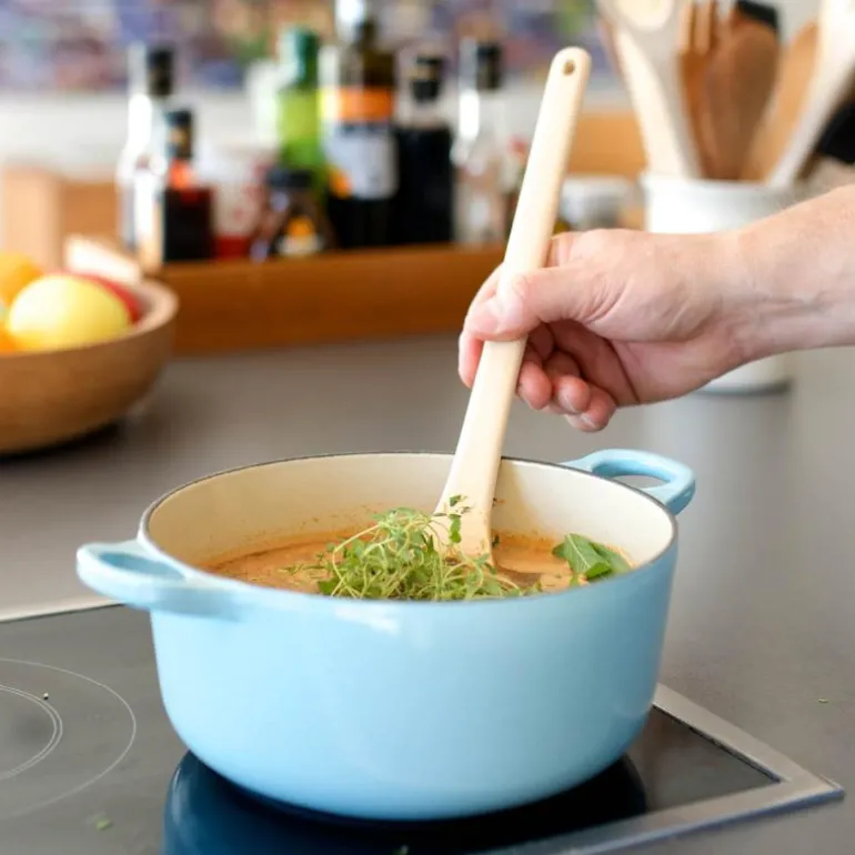 Denne praktiske røreskjeen kommer fra Others sitt snekkerverksted i Jessore, Bangladesh. Den lages for hånd i det bærekraftige materialet Gamari – et lokalt treslag som vokser vilt og krever lite vann i vekstperiodene. Treslaget bli motstandsdyktig og egner seg godt til bruk i kjøkkenredskaper.