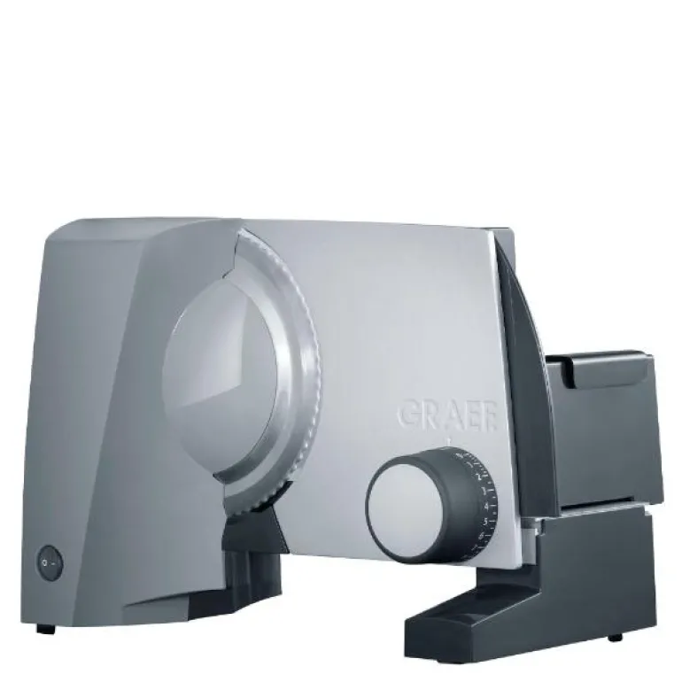 Skjæremaskinen G52 fra Graef, er en kompakt slicer som passer inn i selv de minste kjøkken, men samtidig gir den kvaliteten som forventes av de tyskproduserte Graef maskinene. Oppskjærsmaskinen er utstyrt med to kniver, en glatt og en tagget. Med den taggete kniven kan man enkelt skjære gjennom brød, pølser, ost og lignende. Det glatte bladet egner seg spesielt godt til å kutte tynne kjøttskiver til koldtbordet, grønnsaker og mye mer. Knivenbøadet er dekket med lavfriksjonsmaterialte slik at mat ikke fester seg til det.