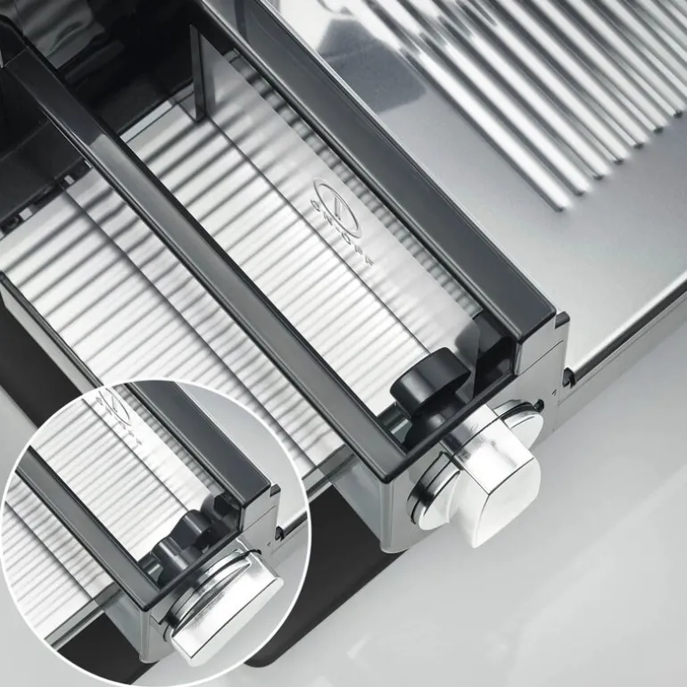 Maskinen er bygget på en robust glassplate som gir både stabilitet og et moderne uttrykk på kjøkkenbenken. Vognen kan enten beveges kontinuerlig ved hjelp av et dreiehjul på siden eller ved å aktivere den praktiske hurtigknappen.
