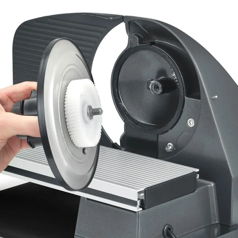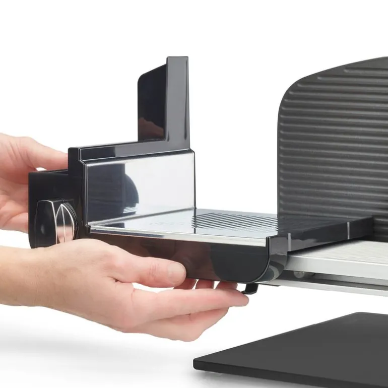 Klingen er skjult bak en avtakbar bladdekselplate i rustfritt stål, noe som gjør rengjøring og vedlikehold enklere. Combi-feste PRO kombinerer mattholder og MiniSlice i én løsning. Dette er en skjæremaskin som egner seg like godt på profesjonelle kjøkken som hjemme på kjøkkenbenken.