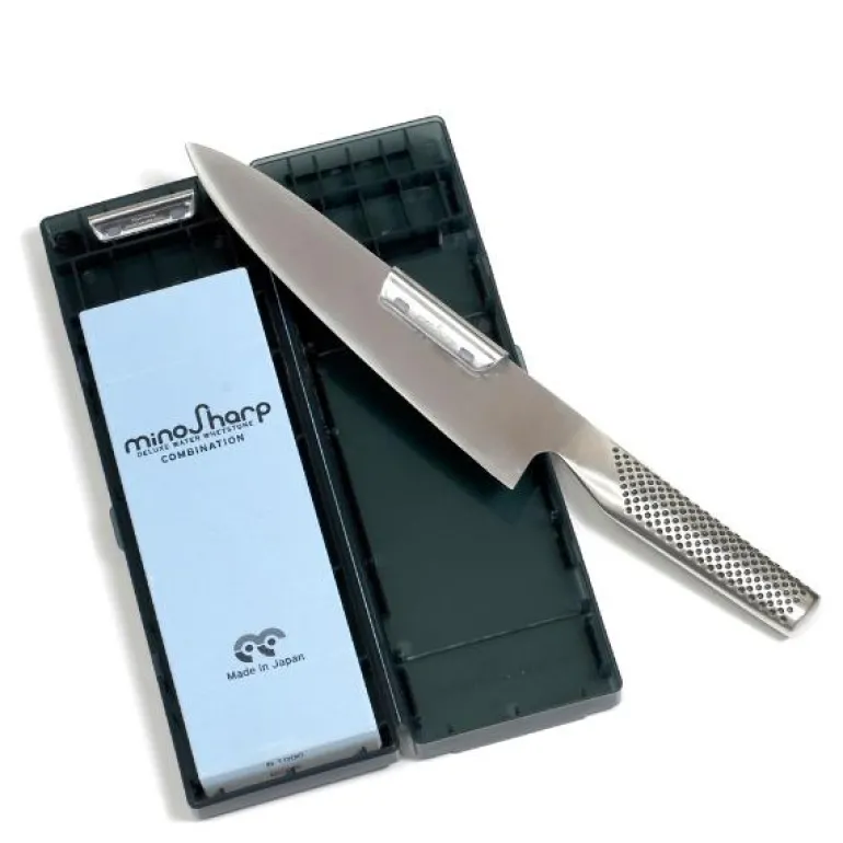 En dobbeltsidig slipestein med to grove størrelser, grov (220 i kornstørrelse) og middels (1000 i kornstørrelse). Bruk den grove steinen til å slipe skikkelig sløve kniver eller til å fjerne hakk i eggen og den middels grove steinen til hverdagssliping. Steinen kommer med to forskjellige slipefiksturer som hjelper deg med å slipe i riktig vinkel.