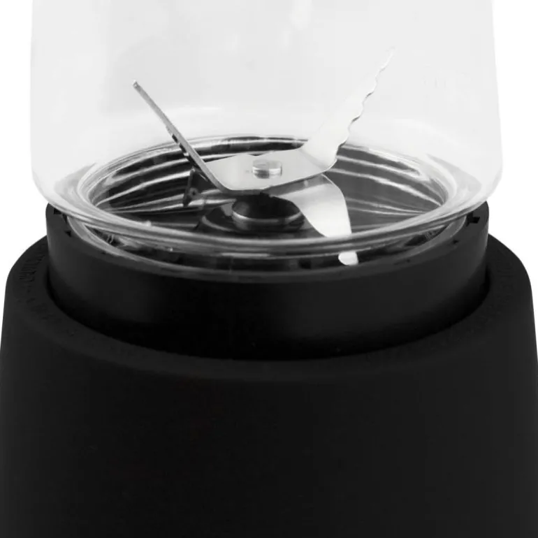 Smoothiemakeren er utstyrt med en romslig 500 ml flaske og rustfrie stålknivblader som gir effektiv miksing hver gang. Den medfølgende flasken har et praktisk lokk med drikketut og holdekrok, ideell for å ta med seg drikken på farten. Beholderen og lokket kan vaskes i oppvaskmaskin for enkel rengjøring.