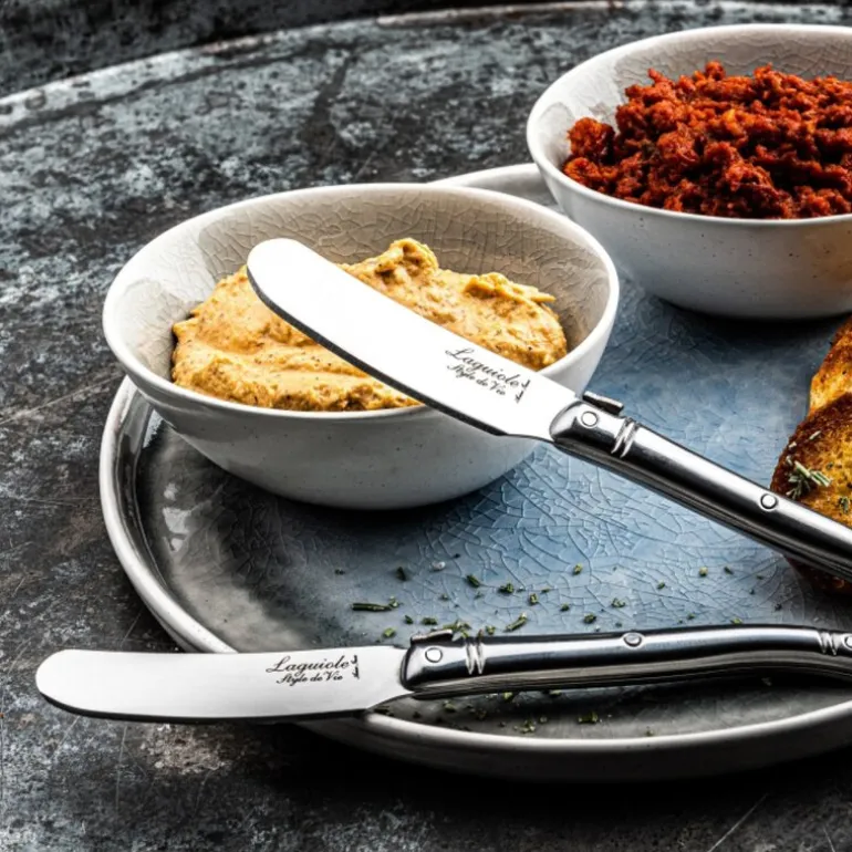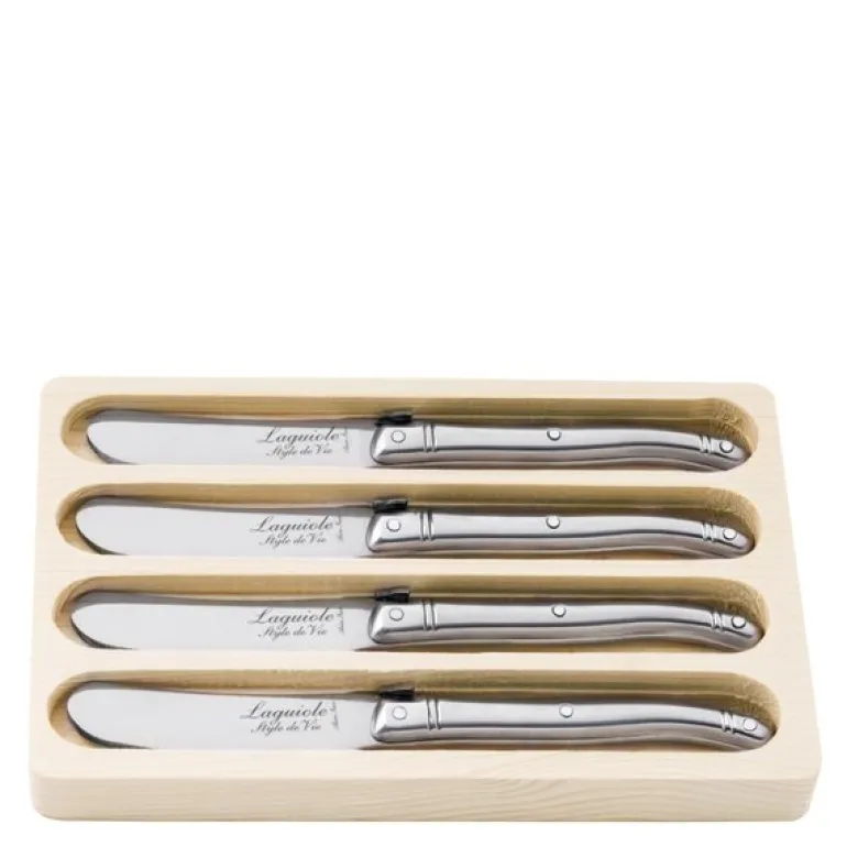 Laguiole smørkniver i rustfritt stål gir et stilrent og allsidig uttrykk til måltidet. Dette 4-delte settet er utformet for å passe like godt til en elegant middag som til et uformelt frokostbord. Det slitesterke stålet gjør dem både pene og praktiske.