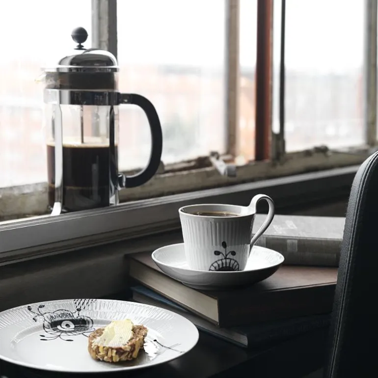 Dette serviset er mye mer enn bare porselen. Det viser at selv de mest solide tradisjoner kan tåle å bli utfordret. Hva som en gang var kjent og elsket for å være liten og blå er nå like ettertraktet i sin forstørrede svarte versjon, og er en yndet samlegjenstand for designelskere. Sort Mega Riflet skiller seg fra det tradisjonelle blå-hvite universet; de svarte penselstrøkene på hvit porselen utgjør en dramatisk kontrast som passer godt inn i moderne hjem. Sofistikert, vel ansett og litt opprørsk.