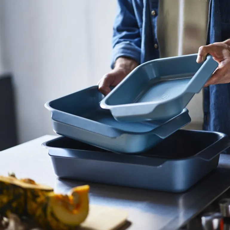 Space ildfast form 30×41,1 cm blå fra Joseph Joseph er designet for å gi enestående brukervennlighet på kjøkkenet. Denne ovnsformen har praktiske håndtak på alle sider, slik at du enkelt kan gripe og håndtere den med ovnshansker. Laget av robust karbonstål med et slitesterkt keramisk non-stick-belegg, er den ideell for alt fra stekte grønnsaker til saftige kjøttretter. Det unike, stablede designet gjør det mulig å organisere de ildfaste formene pent sammen, slik at du kan spare plass i skuffene.