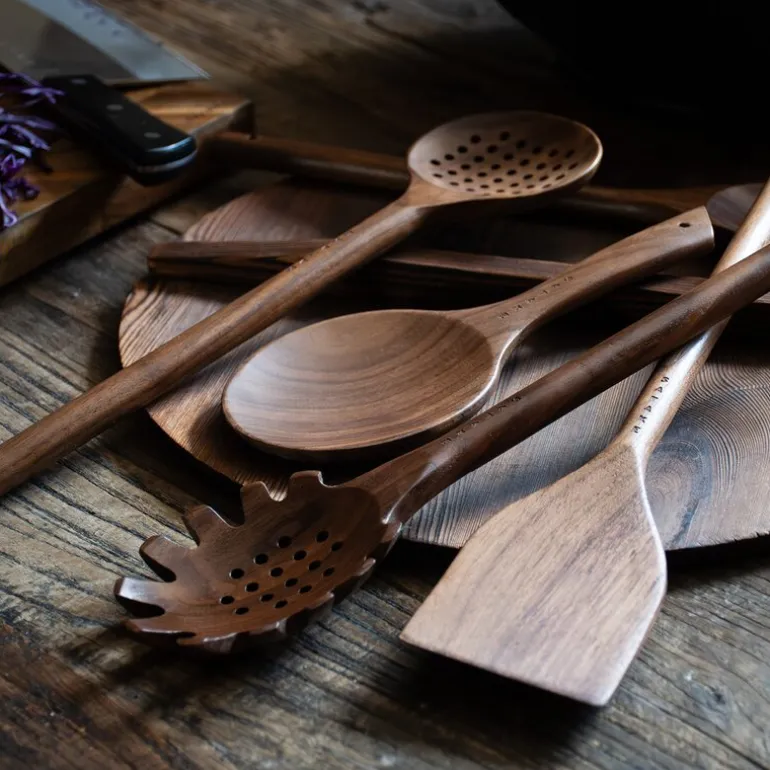 For å sikre at redskapene beholder sin naturlige skjønnhet og levetid, bør de vaskes for hånd og tørkes grundig etter hver bruk. Ved behov kan de oljes inn med vegetabilsk olje for å bevare valnøttens vakre glans og sikre at de holder seg i god stand i mange år fremover.