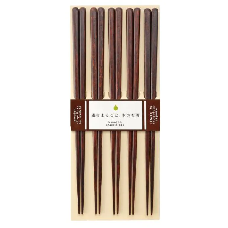 Fem par spisepinner fra japanske Kawai. Pinnene har brun trefarge og tåler oppvaskmaskin.