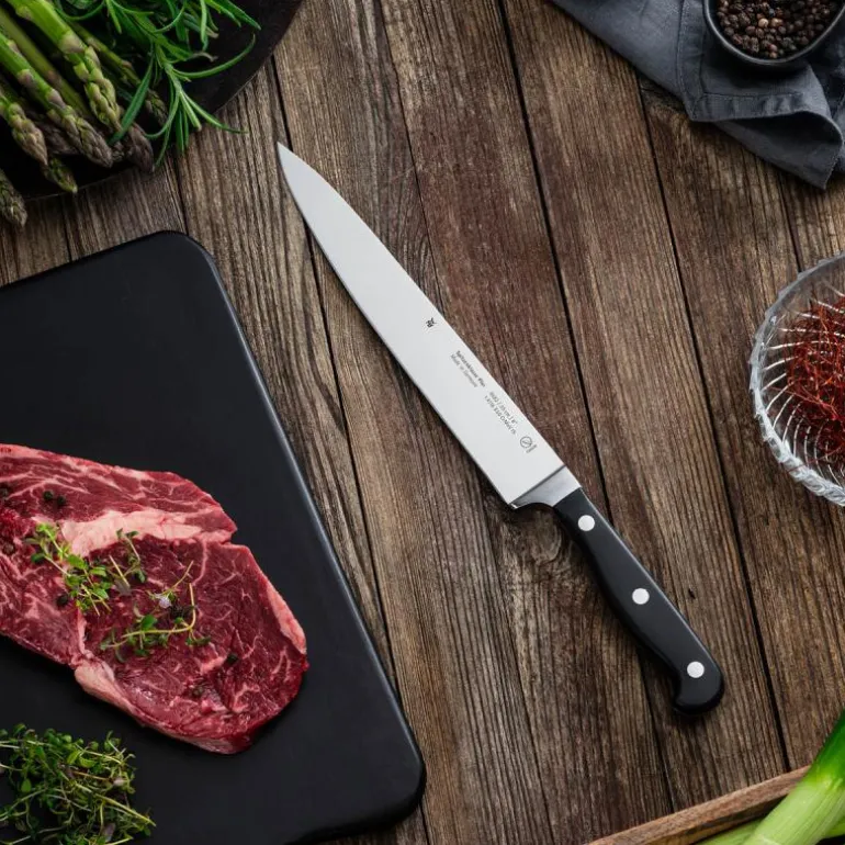 Oksekjøtt, kylling eller lam – rått, kokt eller stekt: en forskjærkniv skjærer lett gjennom alle typer kjøtt. Forskjærkniver har et lett kurvet, spisst blad på mellom 15 og 30 cm i lengden. Dette er den optimale lengden for å skjære gjennom selv de tykkeste steker uten noen stor motstand. Og best av alt: Forskjærkniver skjærer så presist at de løsner kjøttets tynne fibre rent mens de bevarer den dyrebare kjøttsaften. WMFs forskjærkniver er presisjonsslipt, noe som både gjør dem ekstremt skarpe og ekstremt holdbare. De fås i en rekke design for både amatørkokker og profesjonelle kokker. Dessuten er forskjærkniver også ideelle til å tilberede fisk.