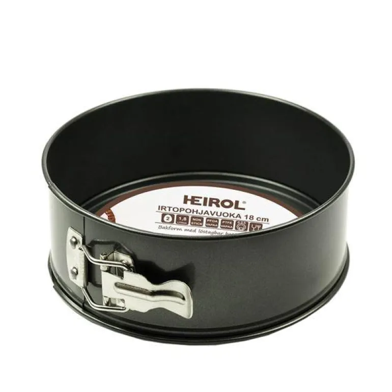 Heirol springform med non-stick-belegg. Formen er 18 cm i diameter, 6,5 cm høy og rommer 1,8 l. Fri for PFOA og PTFE.