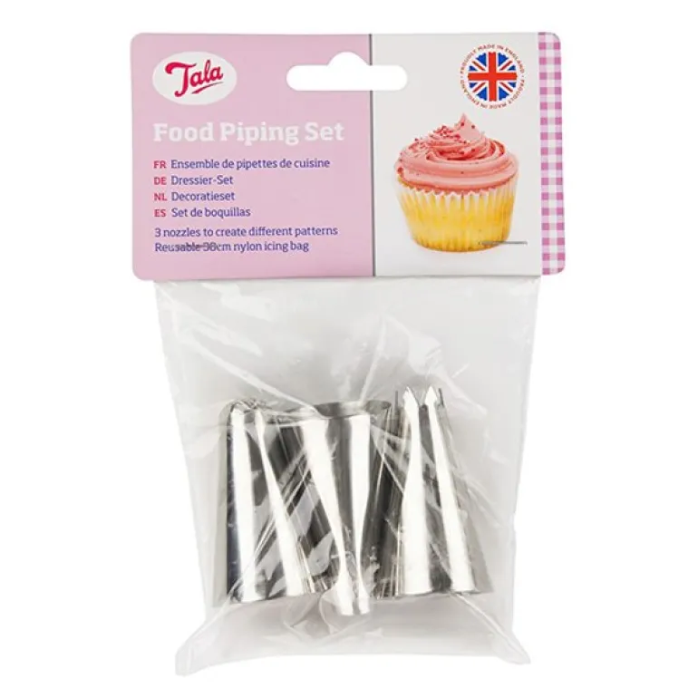 Talas sprøytesett med store tupper er ekstra sterkt og gjenbrukbart, noe som gjør det ideelt for å sprøyte ulike typer mat. Dette dekoreringssettet inneholder tre munnstykker som er perfekte for smørkrem, glasur, kremost, pisket krem og potetmos. De inkluderte tuppene er: 3 Stor tykk glatt, 6 Stor fin stjerne og 7 Stor stjerne. Med dette settet kan du enkelt skape vakre og profesjonelle dekorasjoner på bakverkene og rettene dine. Et uunnværlig verktøy for alle som elsker å dekorere og eksperimentere på kjøkkenet.