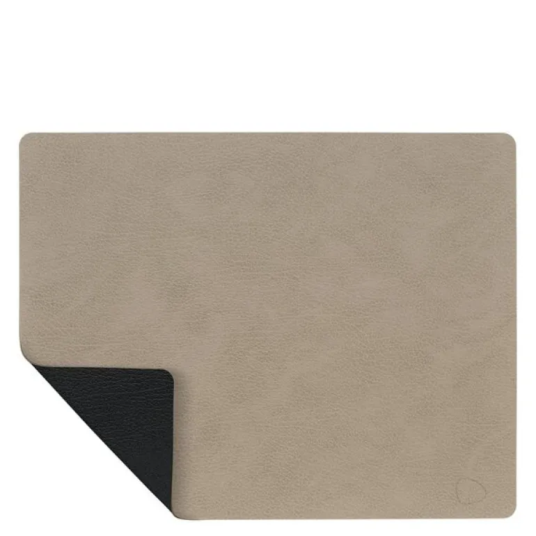 LIND DNA Square Bull brikke tosidig varmgrå/svart er en vendbar spisebrikke i OEKO-TEX® resirkulert skinn med forskjellige farger og overflater på hver side. De forskjellige fargene gjør det mulig å endre utseendet på borddekningen på kort tid.