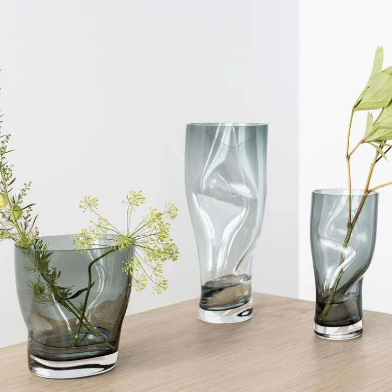 Squeeze tulipanvase fra Orrefors har en bølgende form som endres i ulike vinkler avhengig av hvordan den er plassert. Etter at vasen er blåst, og mens den fortsatt er varm, «klemmes» den sammen for hånd to steder. Disse «klemmene» danner et kryss inni som hjelper til med å holde blomstene på plass. Designet av Lena Bergström.