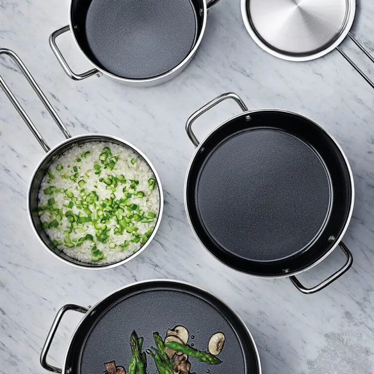 - Bunn: aluminium/rustfritt stål Kropp:90% recycled post-consumer rustfritt stål, Keramisk Slip-Let®-beleggHåndtak: rustfritt stål