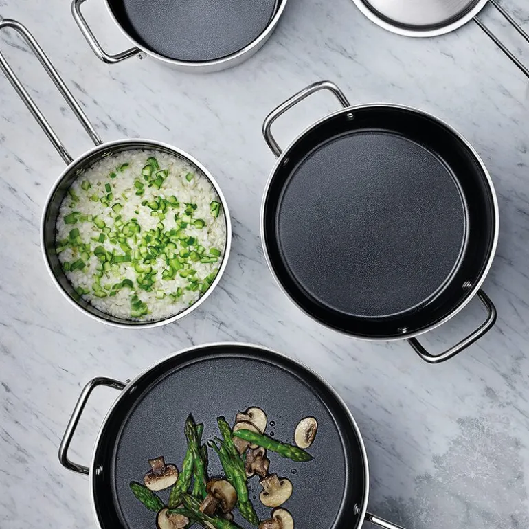 - Bunn: aluminium/rustfritt stål Kropp:90% recycled post-consumer rustfritt stål, Keramisk Slip-Let®-beleggHåndtak: rustfritt stål