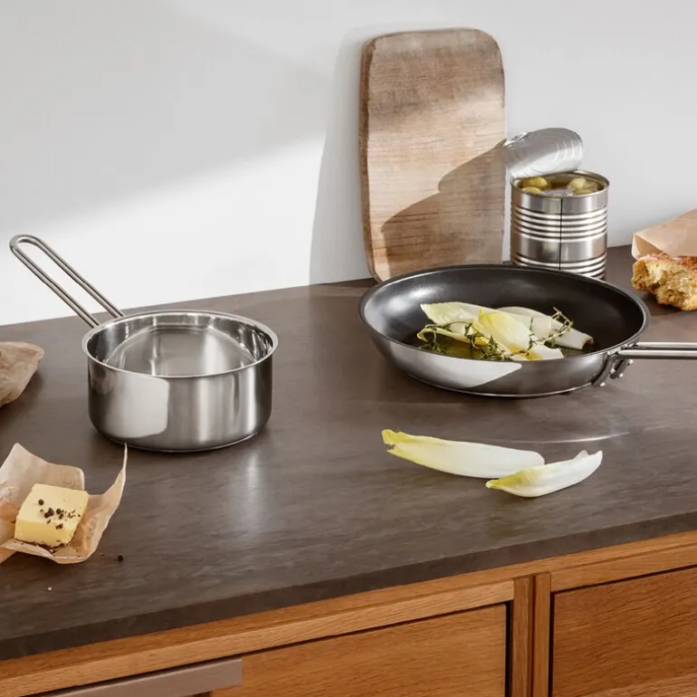 Stainless Steel sautékasserolle 1,3L fra Eva Trio. Sautékasserollen er ideell for tilberedning av grøt eller sauser som krever hyppig omrøring, takket være de lave sidene som gjør det enkelt å manøvrere med en visp. Kasserollen er lagd av 90 % resirkulert rustfritt stål – et materiale som ikke bare er ekstremt slitesterkt, men som også lett å holde rent. Designet er basert på det klassiske Ole Palsby / Eva Trio-designet fra 1977, noe som sikrer kompatibilitet med eksisterende Eva Trio-lokk. Kasserollen fungerer på alle typer koketopper og tåler oppvaskmaskin.