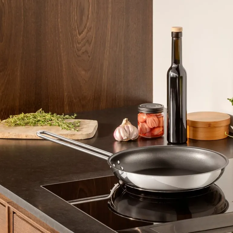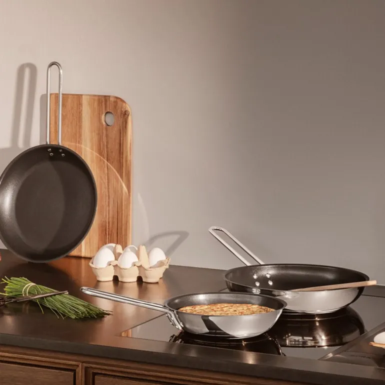 Stainless Steel stekepanne 24 cm Slip-Let® belegg fra Eva Trio. Allsidig stekepanne som håndterer alt fra hard steking på høy varme til skånsom tilberedning av delikate ingredienser. Pannen er lagd av 90 % resirkulert rustfritt stål – et veldig slitesterkt materiale som er enkelt å holde rent og pent. Innvendig er pannen belagt med et Slip-Let®-belegg som effektivt hindrer at maten setter seg fast eller brenner seg, noe som letter både matlagingen og rengjøringen. Pannen tåler oppvaskmaskin og kan brukes på alle koketopper.