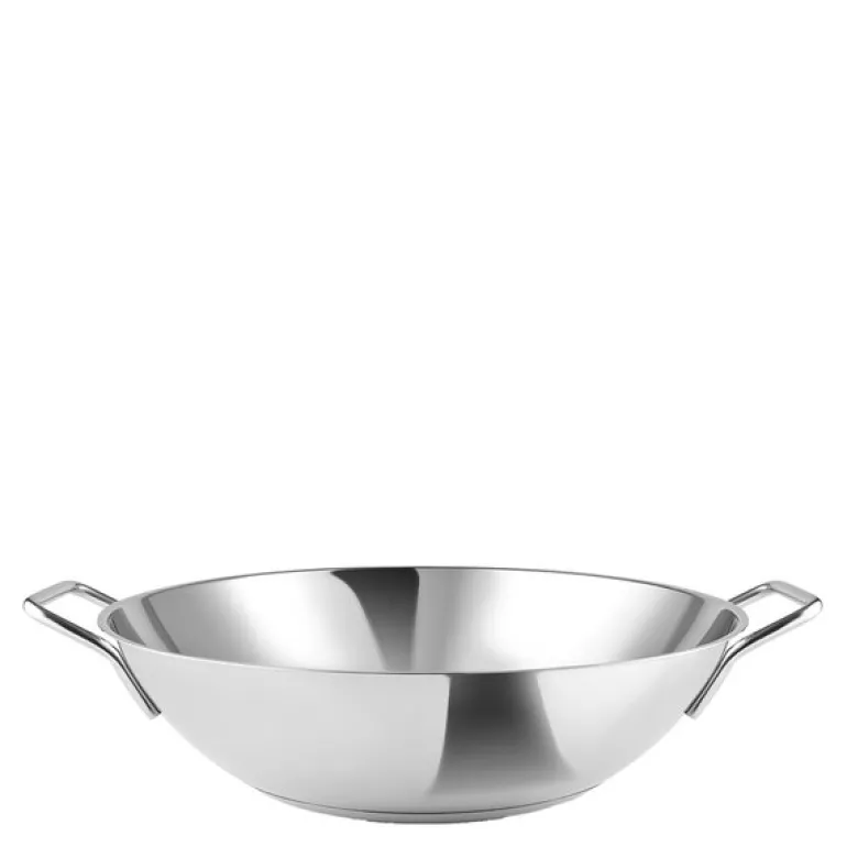 Stainless Steel wok 5L 32 cm fra Eva Trio. Woken, som tradisjonelt brukes i det asiatiske kjøkkenet, har en stor overflate og dype, buede sider som gjør den ideell for hurtigsteking av grønnsaker og kjøtt. Dens karakteristiske form sikrer rask og jevn fordeling av varme og er nyttig for å holde på maten under rask omrøring.