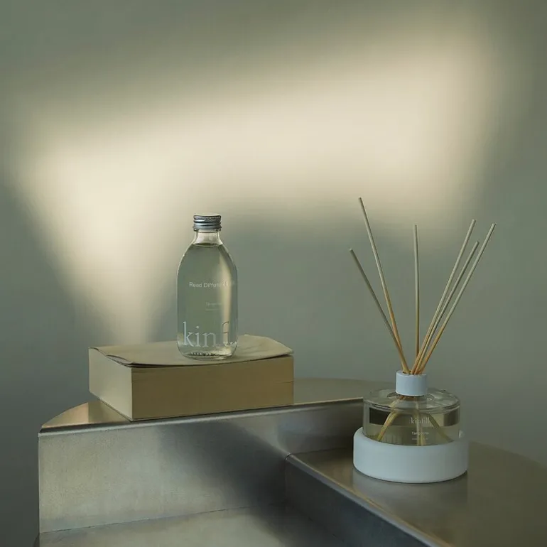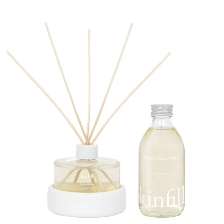 Starter kit Reed diffuser 250 ml flowershop fra Kinfill. Kinfills reed diffuser er gjennomtenkt designet for å fylle ethvert rom med raffinerte dufter. Denne trygge formelen, laget i Nederland, holdes i en unik glass- og keramikkholder laget i Portugal. Duften har en blanding av sprengende blomster, nykuttede stilker, friske grønnskaer og knuste kornblader.