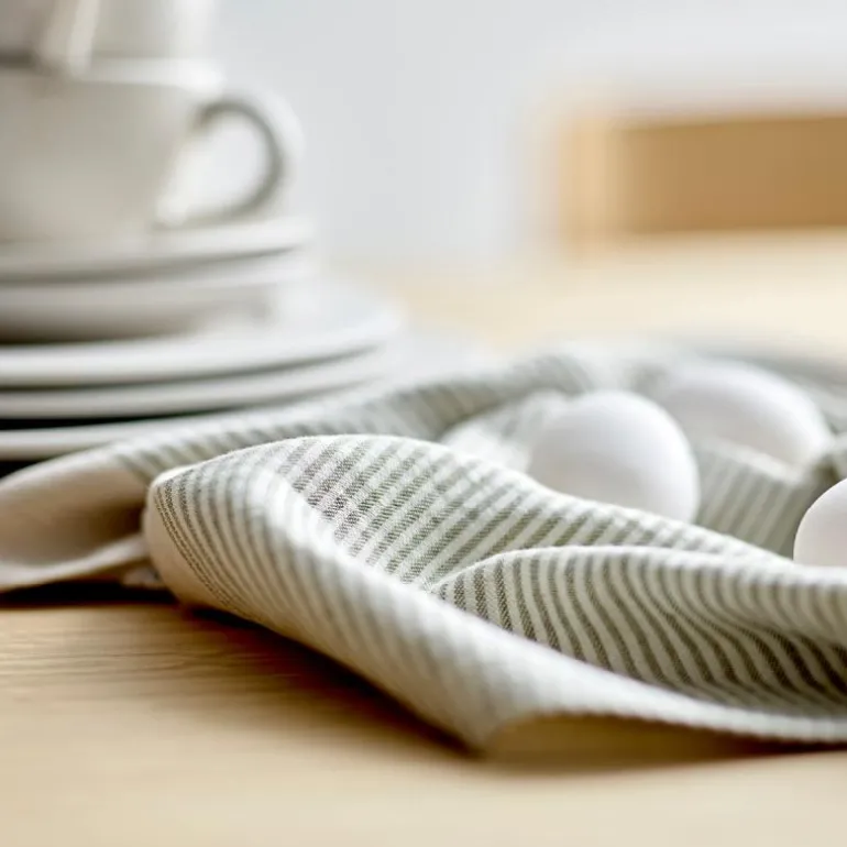 Denne markante stripede designen skaper et klassisk og flott bakteppe for hverdagslivet. Du kan kombinere kjøkkenhåndklær i forskjellige farger for å oppnå en inspirerende og frisk retrostemning, eller du kan velge en minimalistisk look der alle kjøkkenhåndklærne har samme farge. Kjøkkenhåndkleet er laget av bomull og lin.