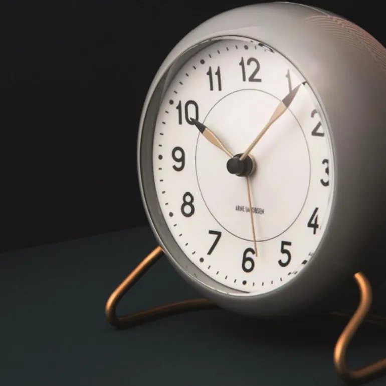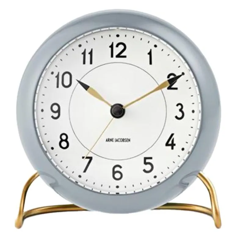 Det elegante Station-borduret fra Arne Jacobsen Clocks ble opprinnelig tegnet helt tilbake i 1939, da Arne Jacobsen designet hjemmet til direktøren for elektrisitetsbedriften Lauritz Knudsen. Det flotte uret i grått/hvitt med matt messingfot måler 11 cm og har både slumrefunksjon og lyssensor som gjør uret ideelt til bruk som vekkerklokke på soverommet. designet er stilfullt med rene linjer og et enkelt uttrykk som passer perfekt inn i alle moderne hjem.