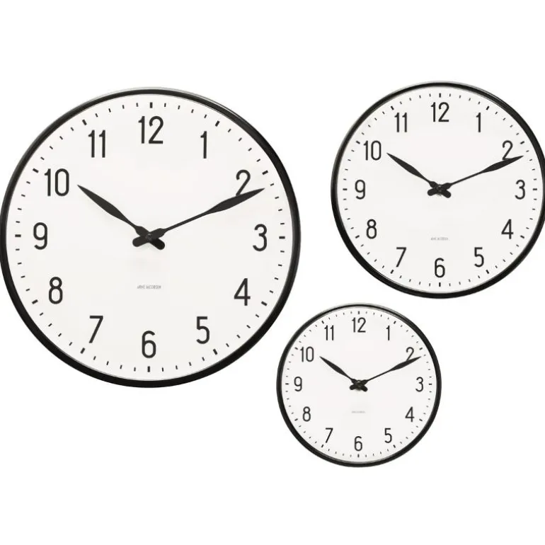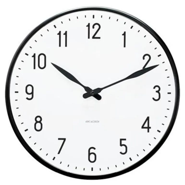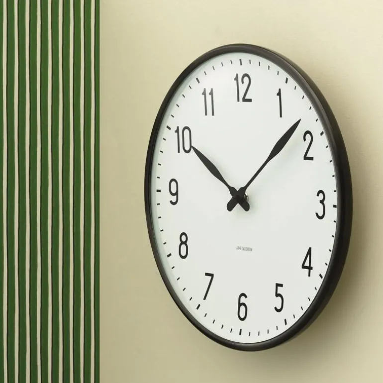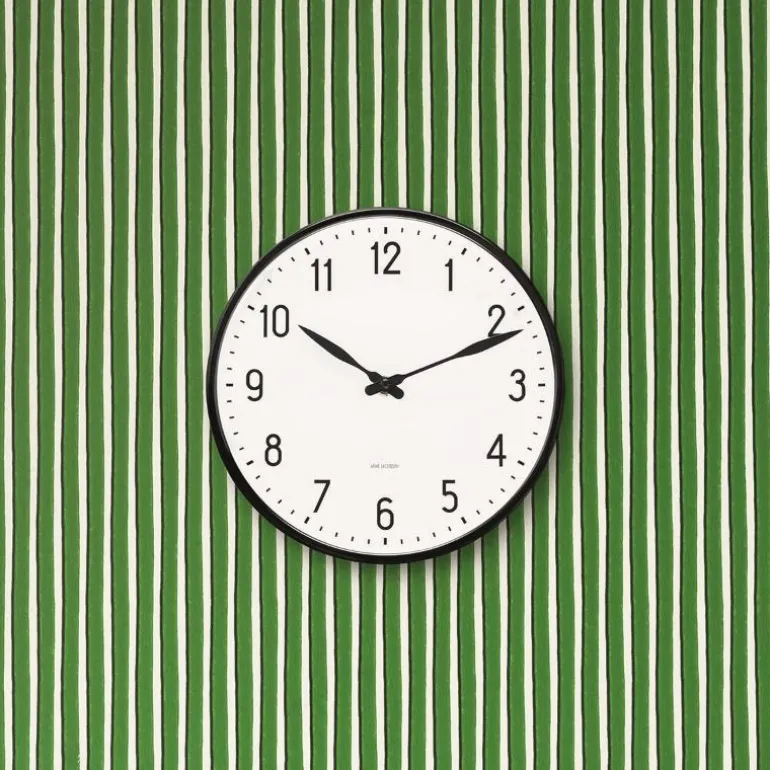 Få kontroll over tiden og sjekk tidens innredningstendenser. Arne Jacobsens Station-klokke ble opprinnelig tegnet til el-vare-produsenten LK i 1941. Originaldesignen for den ikoniske klassikeren er nå gjenskapt og forvandler en anonym hvit vegg til et markant designstatement. Den grafiske designet understrekes av en toppring i sort aluminium. Finnes i tre størrelser, her i mellomstort format. En god gaveide som vil gå i arv i generasjoner.