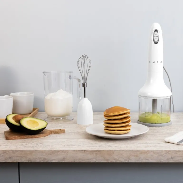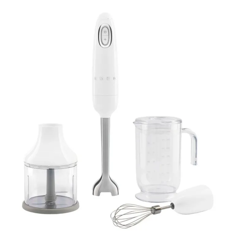 Smegs stavmikser er en slitesterk og funksjonell kjøkkenmaskin, utformet med et ergonomisk, gripevennlig håndtak som gir både komfort og kontroll under bruk. Med sin kraftige 700 W motor og praktiske hastighetsregulator på håndtaket, blir både lette og krevende oppgaver enkelt håndtert. Turbofunksjonen gir ekstra kraft når det trengs, slik at du raskt kan blande og mikse selv de hardeste fruktene og grønnsakene, og oppnå den perfekte mykhet og konsistens i dine retter.