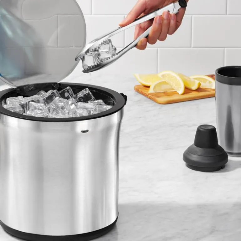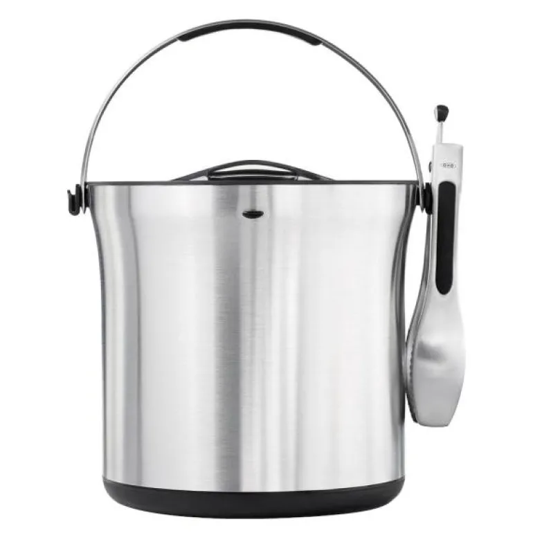 Hold isbitene kalde med OXOs isbøtte med tang. Isbøtten har dobbeltvegg som holder på kulden og forhindrer kondens på utsiden. I bunnen er det dype kanaler som holder smeltet vann vekk fra isbitene, så disse holder seg frosne i lenger tid. Det gjennomsiktige lokket åpnes med et enkelt trykk, så du kan håndtere det med én hånd, og en skli-sikker bunn gjør at det står godt fast på bordet. Isbøtten leveres med en tang som kan fastgjøres på siden av bøtten. Tangen har skarpe tenner, så den holder godt fast i isbitene. Isbøtten rommer 4L.