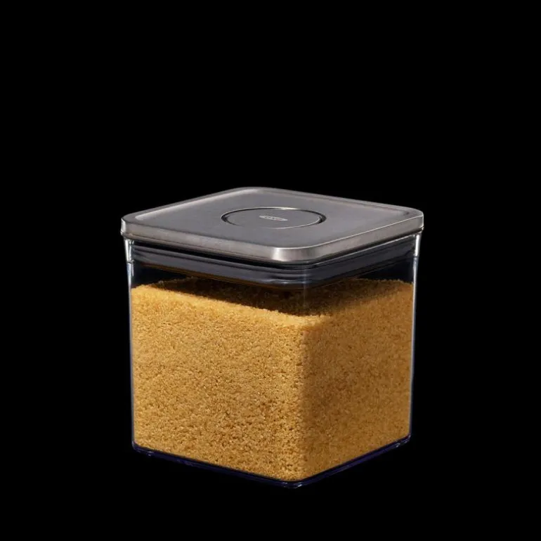 SteeL POP Containers fra OXO er lufttette oppbevaringsbokser til sukker, mel, pasta, ris og andre tørre matvarer. De har et elegant design med lokk i rustfritt stål, fås i mange størrelser og kan stables, så de utnytter plassen og passer i alle kjøkkenskapene. Lokket har en unik trykkfunksjon som sørger for at det lukker helt tett, samtidig som det fungerer som et håndtak, når det åpnes. Den lufttette forseglingen holder maten frisk lenger, og boksenes rundede hjørner gjør det lett å helde ingrediensene ut av dem. På undersiden av lokket kan man feste forskjellige tilbehør, som kjøpes separat. Lokket kan demonteres for grundig rengjøring, og både selve POP Containeren og lokket tåler oppvaskmaskin. POP Containers kan også brukes i garasjen, på hobbyrommet, barnerommet, osv.