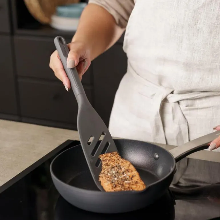 Grå stekespade med spiss 32,5 cm fra Zyliss. Denne stekespaden har en spesielt tynn forkant, som er veldig nyttig for å snu mat. Den brede grunnformen gjør det enkelt å snu på panneretter. Stekespaden er ergonomisk å holde i, og kan brukes i non-stick panner.