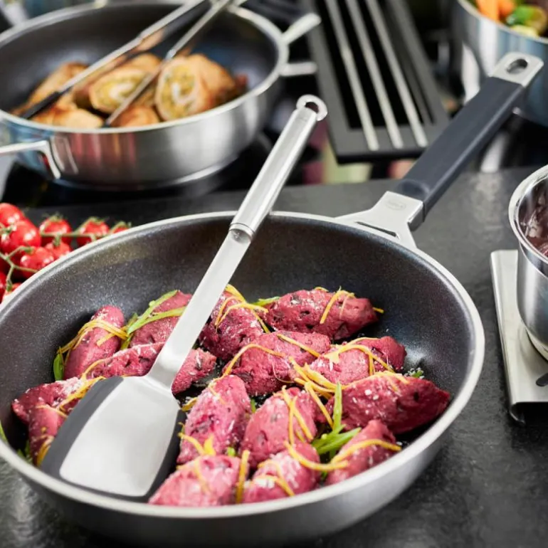Rösle stekespade i stål og svart er et allsidig og pålitelig redskap som gjør matlagingen både enklere og mer effektiv. Med en lengde på 35,5 cm gir denne stekespaden et godt grep og enkel håndtering, uansett om du snur pannekaker, løfter fiskefileter eller serverer stekt mat.