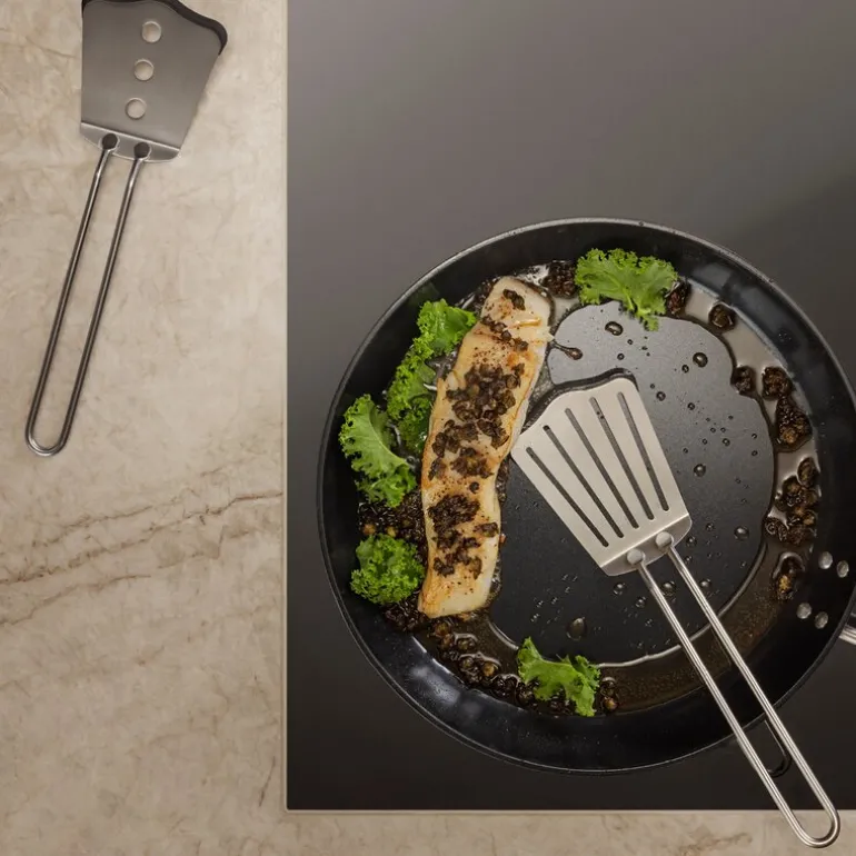 Eva Trio stekespade med silikon er et pålitelig og praktisk verktøy som gjør matlaging enklere og mer effektivt. Den ergonomiske utformingen og den rustfrie stålkroppen gir et komfortabelt grep og god holdbarhet. Silikontuppen er nøye utviklet for å være skånsom mot panner og gryter, og beskytter mot riper selv ved hyppig bruk. Den flate og vinklede kanten gjør det lett å snu og løfte matvarer som pannekaker, fiskefileter eller speilegg med presisjon.