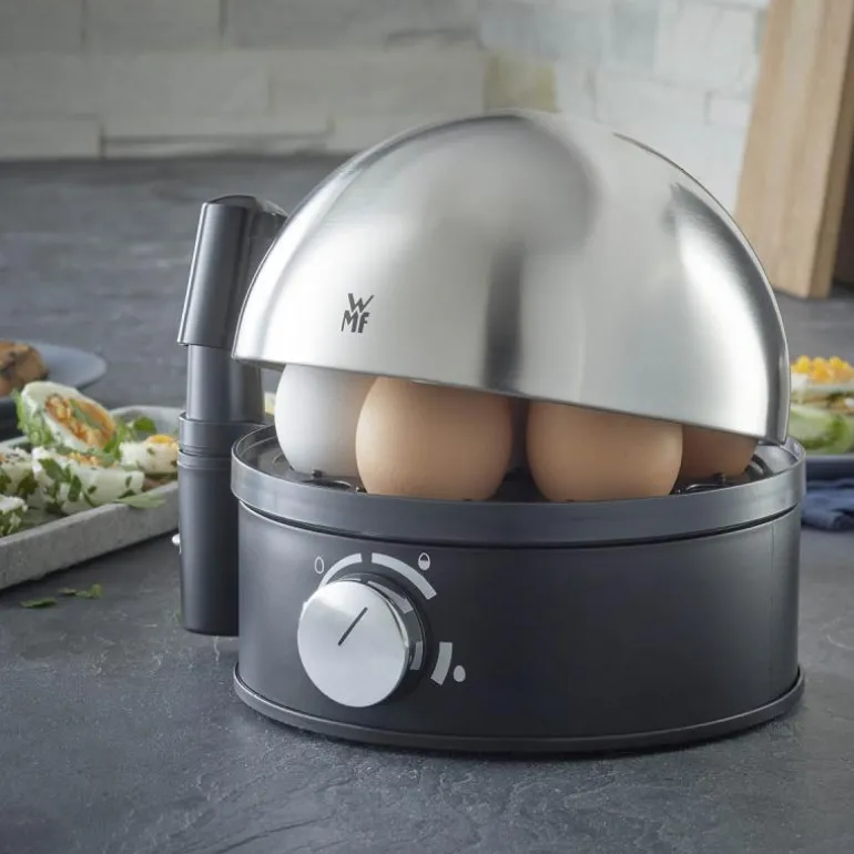 Stelio eggekoker kombinerer stilrent design og praktisk funksjonalitet, og er det perfekte verktøyet for enkel og presis tilberedning av egg. Med sin overflate i børstet Cromargan® rustfritt stål og kapasitet til å koke opptil 7 egg samtidig, er den både elegant og effektiv. Den avanserte elektronikken regulerer koketiden, slik at du alltid kan oppnå ønsket resultat – enten du foretrekker bløtkokte, medium kokte eller hardkokte egg.