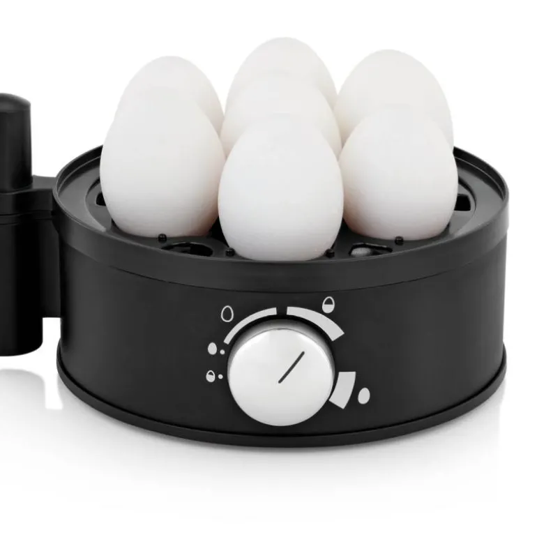Eggekokerens avtakbare eggholder gjør det enkelt å tilberede energibesparende porsjoner fra 1 til 7 egg. Timeren sørger for presis tilberedning uten behov for å måle vannmengde, og den smarte funksjonen for fortsatt tilberedning lar deg koke egg med ulike hardhetsgrader i samme prosess. Når de myke eggene er klare, kan du enkelt fjerne dem og la de resterende koke videre.