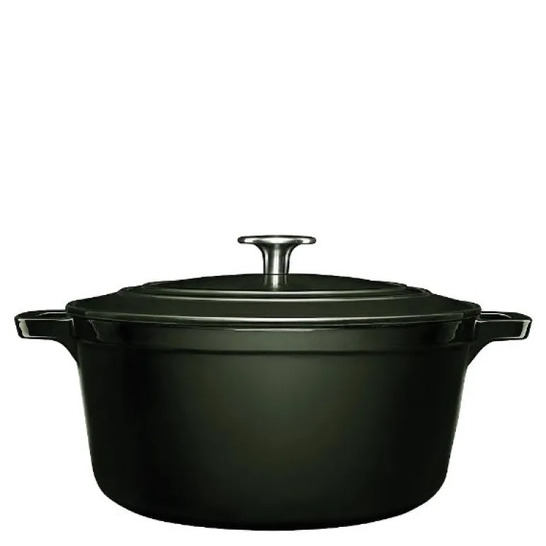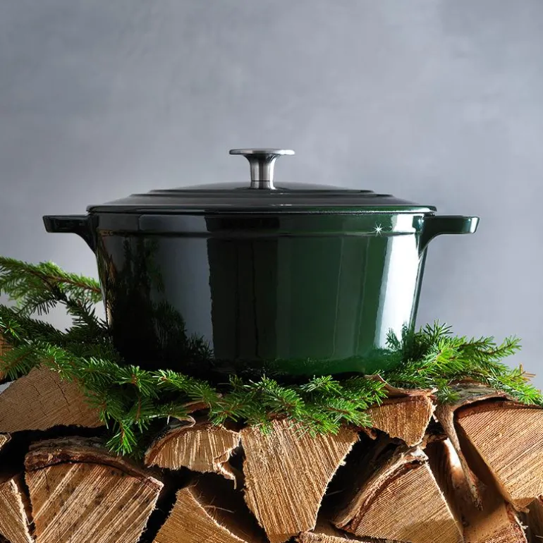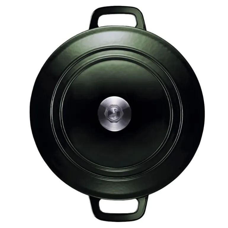 Stenfors støpejernsgryte rund 4,4L i grønn er en robust og funksjonell gryte som passer for både små og store husholdninger. Laget av emaljert støpejern, gir gryten jevn varmefordeling som holder på varmen helt til kantene, noe som sikrer optimale resultater ved matlaging. Emaljen absorberer verken smak eller lukt, og den er enkel å rengjøre etter bruk. Lokket har en knott som gjør at kondensen drypper tilbake i gryten, i stedet for å samle seg langs kantene, noe som forbedrer smaken og konsistensen på maten.